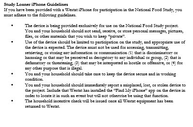 The last section of the initial interview will ask you to collect contact information for adult household members, including names, email addresses, and cell phone numbers. You will also collect permission to send text message reminders to participants who have their own cell phones. The Westat iPhones provided to the PR do not have texting capabilities so they will not be able to receive text message reminders on Westat phones. These reminders will be automatically sent daily at 7:00 PM to all participating NFS adults from a centralized Westat system regardless of if they have filled out that day’s Food Log entry or not. Participants who change their mind and do not wish to receive text message reminders can reply “Stop” to the first text message they receive. Emails will automatically go out to all respondents who provide an email address. The reminder messages will essentially be the same; however, there will be more space to explain details in the email reminders than the text reminders.