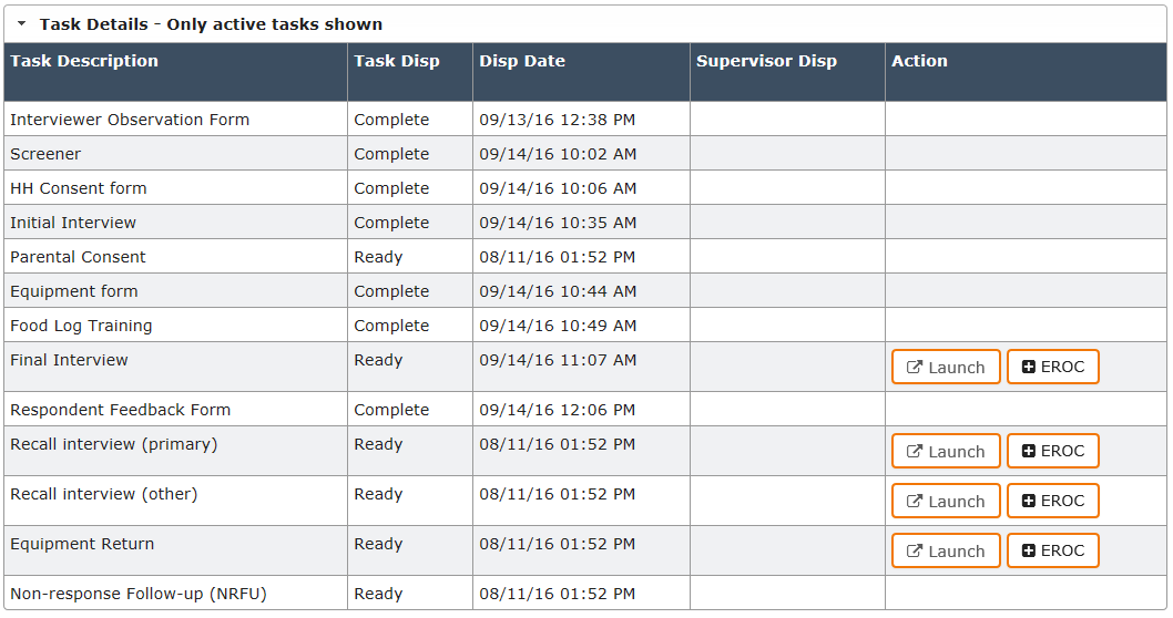 Once all initial visit activities are completed, you will notice that the Action column for the items that have already been completed will be blank and the Task Disposition column will be “Complete”. You will see the “Launch” and “EROC” buttons for the final visit items. Your IMS task details list should look like Exhibit 3-2.