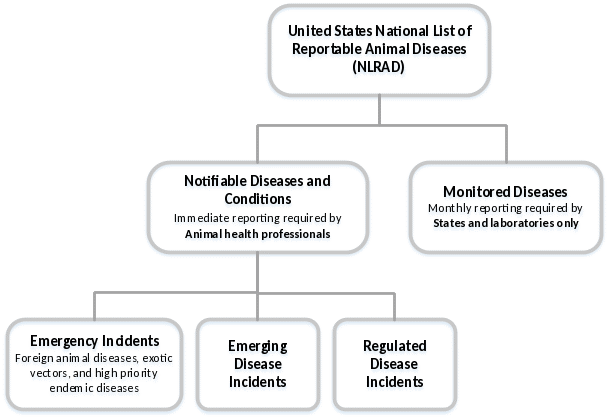 The NLRAD Standards will require information to be collected for two categories: Notifiable Diseases and Conditions and Monitored Diseases (Figure 1). Within the Notifiable Diseases and Conditions category, three sub-categories of diseases have been identified: emergency incidents (such as foreign animal disease investigations, e.g., Rift Valley fever, Virulent Newcastle disease, African swine fever), emerging disease incidents (e.g., SARS-CoV-2/Cov-19 Virus), and regulated disease incidents (e.g., Spring viremia of carp, equine infectious anemia, Pullorum disease). Monitored diseases generally are those that are endemic (present) in the United States (e.g., Bovine viral diarrhea, Tularemia, Enzootic abortion of ewes).
