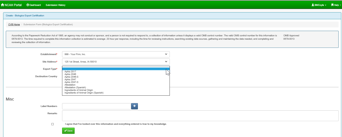 APHIS Forms 2017, 2046, 2046-S, 2047 & 2047-S https://ncahappspub.aphis.usda.gov/NCAHPortal/auth/biologicsExportCertification/create