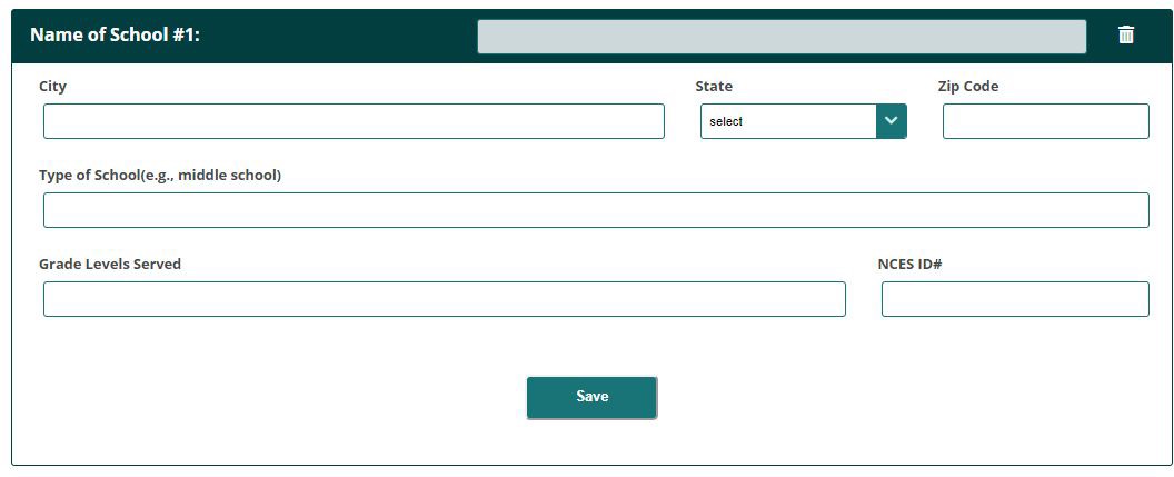 To delete a school, simply click the Trash Can icon in the upper right corner of that school’s header bar at any time. Be careful, because there is no undelete feature. If you delete a school you didn’t mean to, you will have to re-enter the data from scratch.
