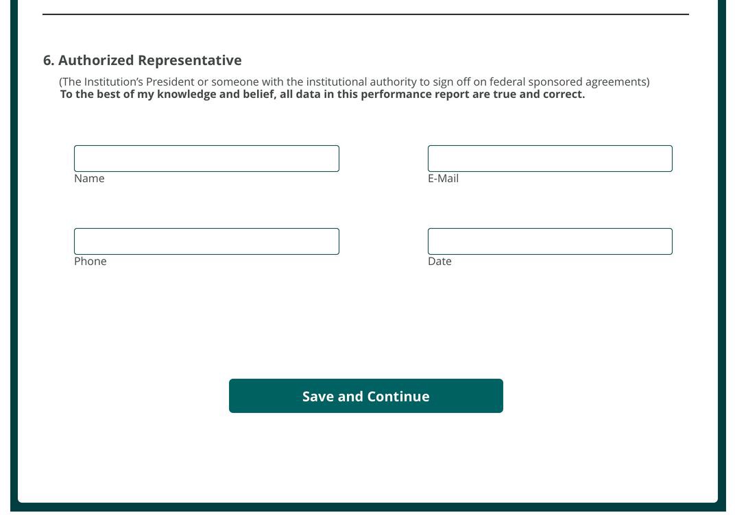 The Certifying Official should enter their name email address, phone number, and date on this tab. By completing these fields and saving the page, they are certifying that all data in the performance report are true and correct to the best of their knowledge.