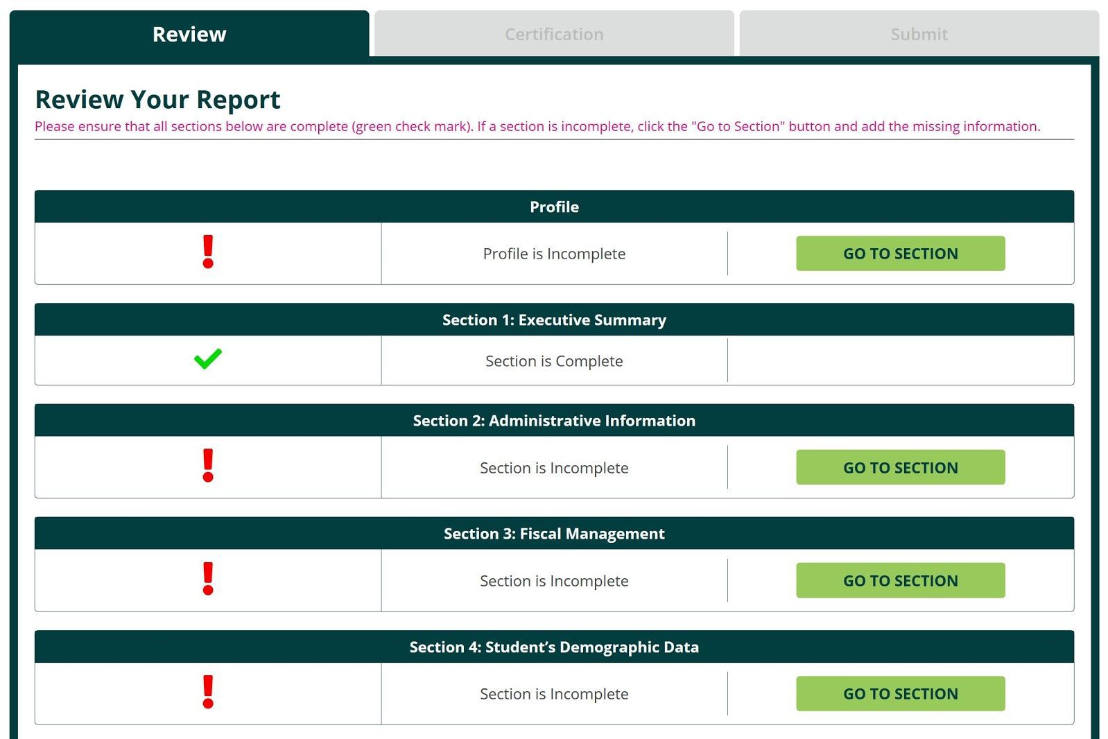 The Review tab performs a check, making sure that all fields are complete prior to submission. Please note that ALL FIELDS are required. If a question does not apply to your grant or if you have no data to supply, please enter “n/a” or “not applicable” in text fields, and a zero in number fields.