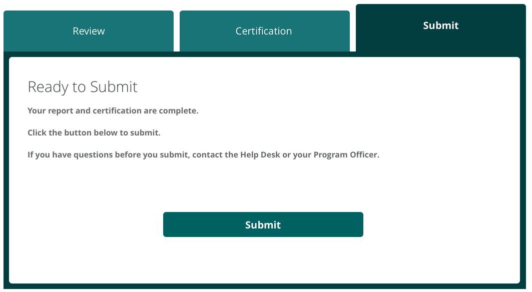 Once the report is submitted, it is locked and cannot be edited. If you need to make changes, contact your Program Officer or the Help Desk before the report deadline and request that your report be unsubmitted so you can make edits.