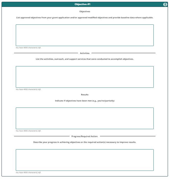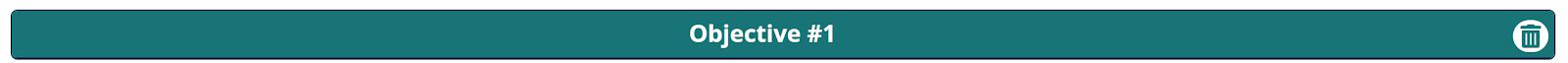 To delete an objective, simply click the Trash Can icon in the upper right corner of that objective’s header bar at any time. Be careful, because there is no undelete feature. If you delete an objective you didn’t mean to, you will have to re-enter the data from scratch.