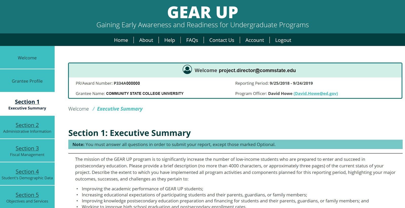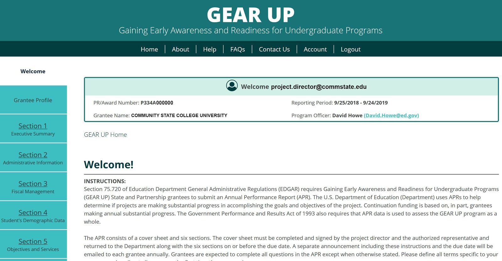 This page provides a quick overview of the GEAR UP Annual Performance Report system and how to use it. We recommend you review the entire User Guide to learn more about how each part of the system works so you can fully understand the GEAR UP annual performance reporting process.