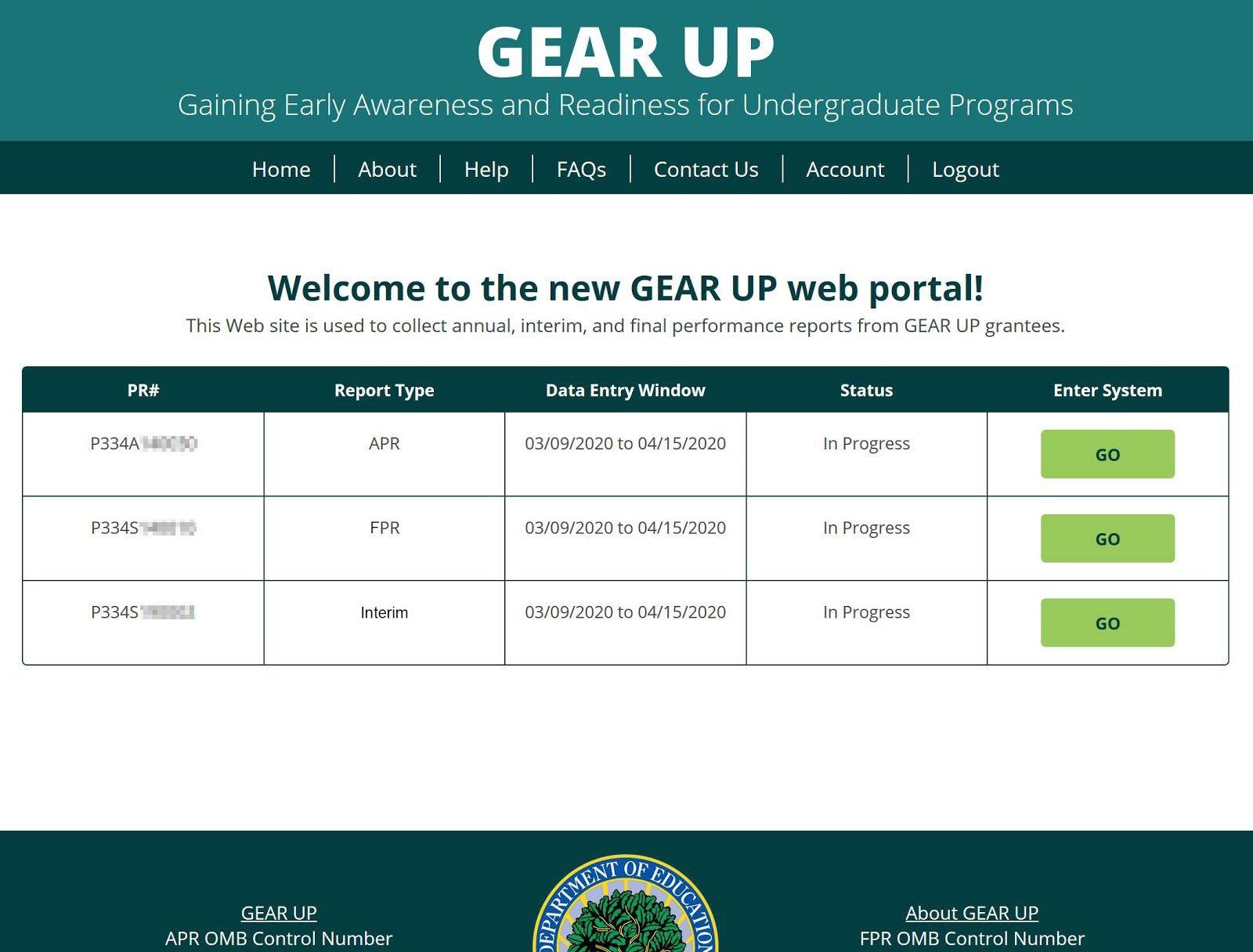 After accepting the disclaimer, you will be able to access the GEAR UP system home page.