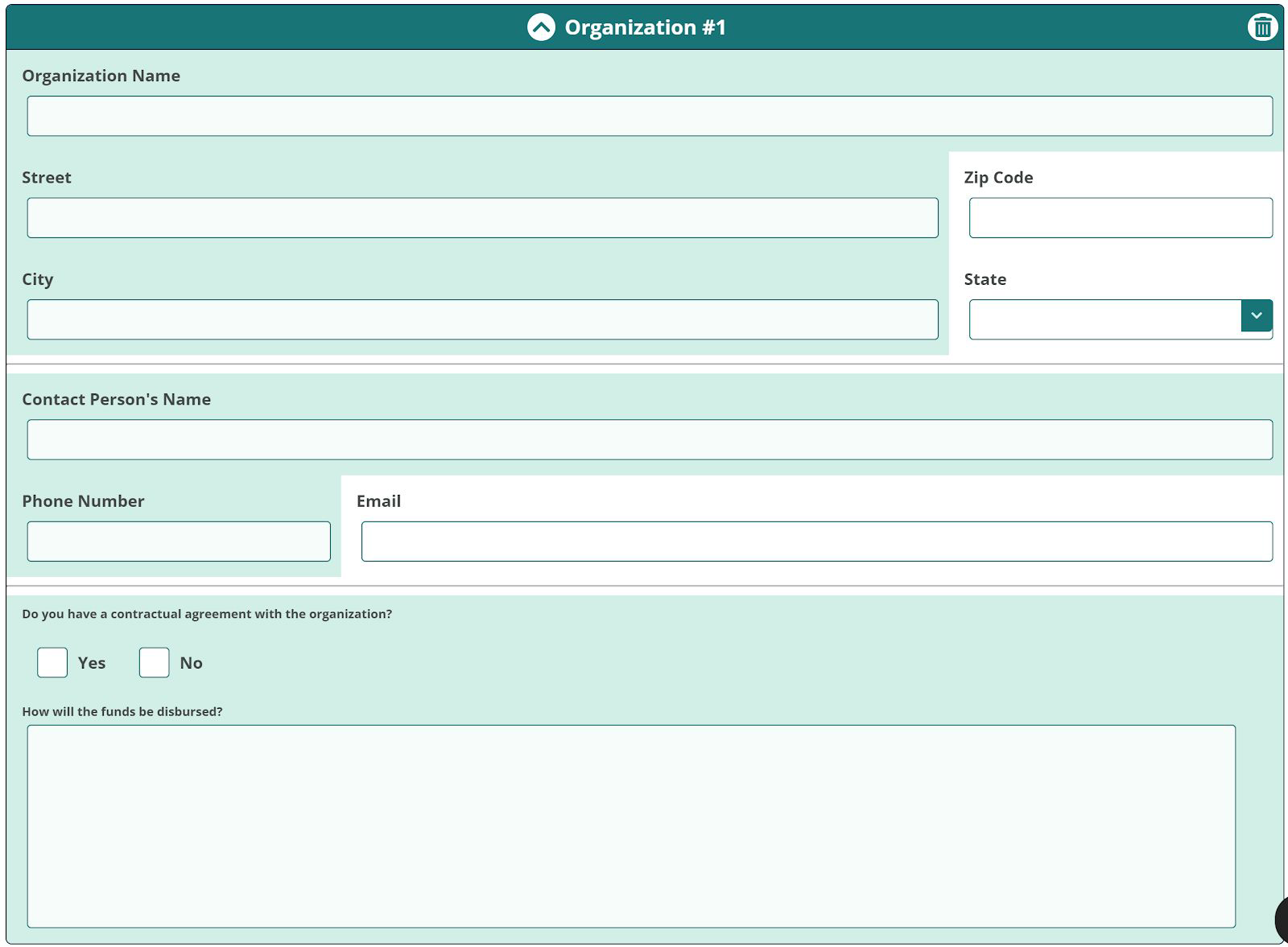 To delete an organization, simply click the Trash Can icon in the upper right corner of that organization’s header bar at any time. Be careful, because there is no undelete feature. If you delete an organization you didn’t mean to, you will have to re-enter the data from scratch.