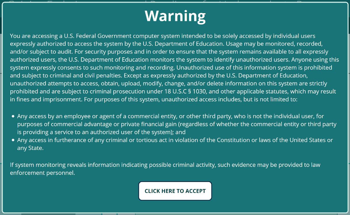 If you don’t accept the terms on the disclaimer screen, you may not use the system.