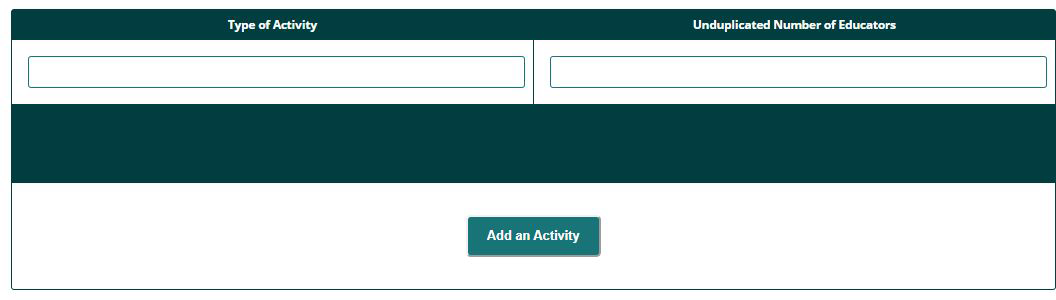 In question 13 you will be asked to create a list of activities provided to educators as part of your approved project design. To get started, click the Add an Activity button.