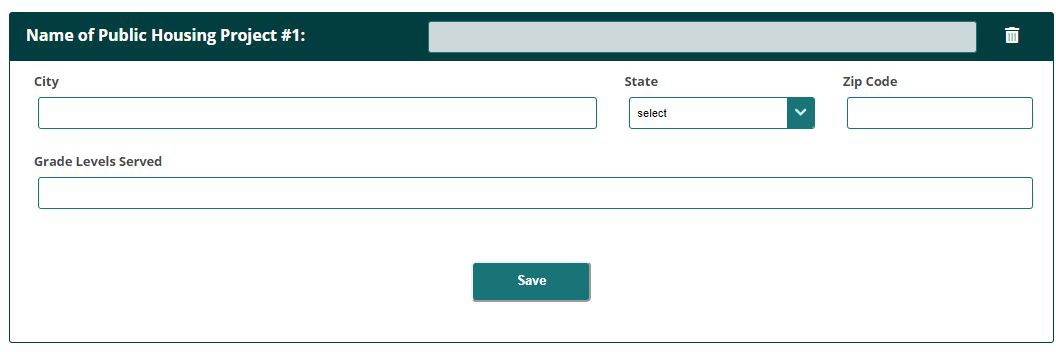 To add another School, click the Add a Public Housing button again, and repeat until you’ve created records for all necessary housing.
