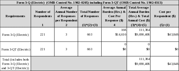 Estimate of Annual Burden: The estimated annual burden and cost (as rounded) follow. (The estimated hourly cost used for FERC Form No. 3-Q is $87.00/hour (for wages plus benefits) and is described above, under FERC Form No. 1.) The burden hours and costs are rounded for ease of presentation. The quarterly filings are generally a subset of the annual filings. For this reason, the XBRL burden (“3-QT”) hours are “0” because the burden associated with the 3-QT is already incorporated into other burden numbers for FERC Form No. 1 and FERC Form No. 2.