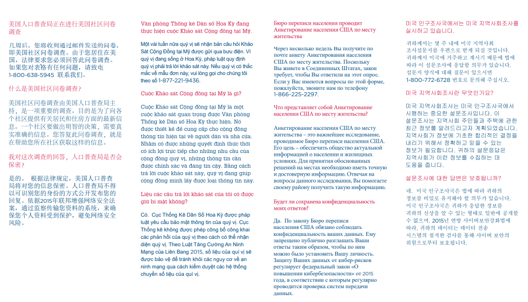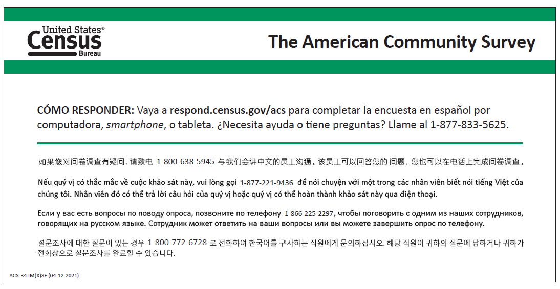 17 We do not expect there to be enough phone responses in Chinese, Korean, and Russian to detect significant differences, but we will monitor the number of responses in those languages to see if the text on the new Instruction Card appears to have an effect on response in those languages.