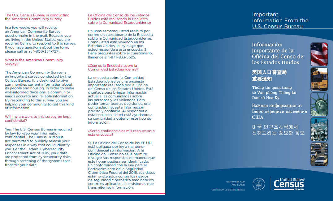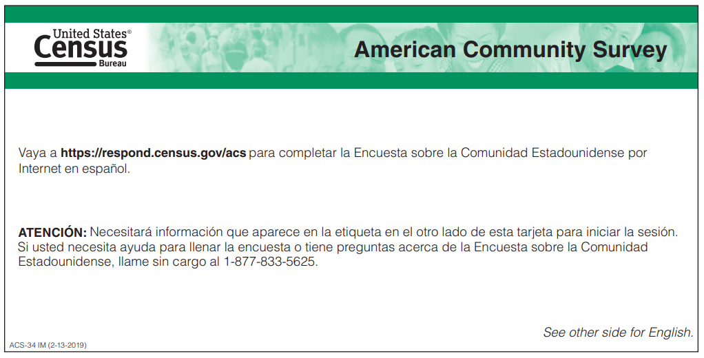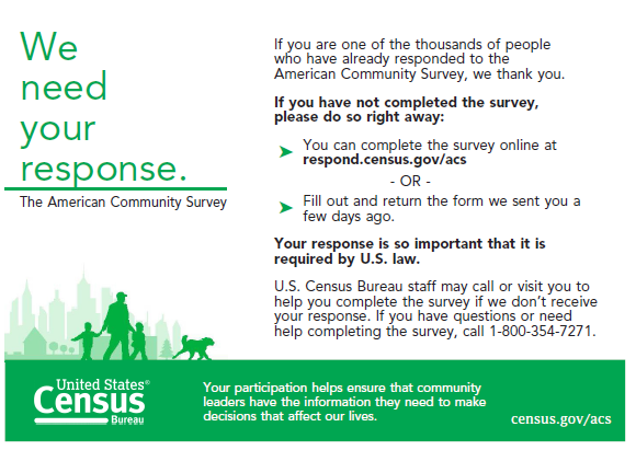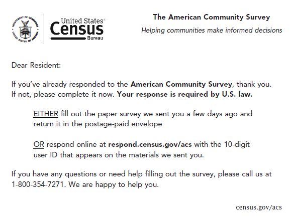 The second mailing focuses on communicating how ACS data has tangible benefits to communities (Reingold, 2014b). This mailing communicates local-level survey benefits because research has shown that prospective respondents are more interested in potential benefits for his or her own neighborhood than for the nation, state, or city (Reingold, 2014b).