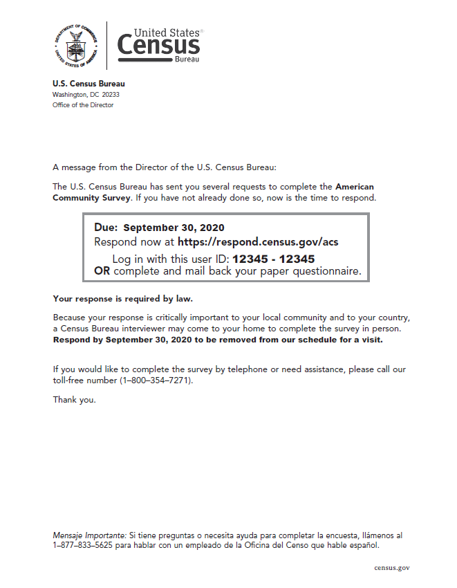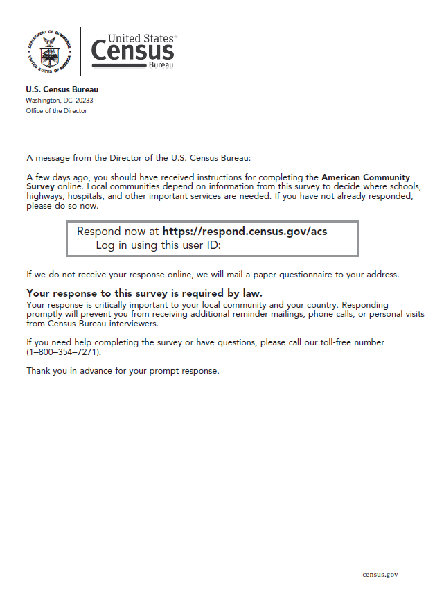A letter sent to all mailable addresses in the CAPI sample that includes an internet user ID. This letter informs households that a Census Bureau interviewer will contact them soon if they don’t respond to the survey. |