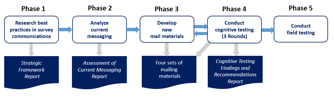 The Census Bureau began the Strategic Framework Project following a 2016 workshop where a panel of experts offered advice on how to improve the ACS mail materials (NAS, 2016). Panelist Nancy Mathiowetz suggested that the Census Bureau develop a strategic plan—grounded in communication theory as well as theories from survey methodology—for messaging in the ACS materials (Mathiowetz, 2016). Mathiowetz thought that having a strategic plan would allow the Census Bureau to judge how expert recommendations fit with the strategic plan. Her suggestion led to the creation of the multi-phase Strategic Framework Project that began in 2017. The five phases of this project are depicted in Figure 1.