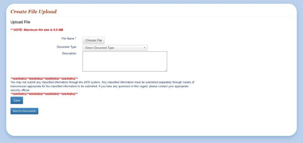 To allow the users flexibility in providing the more complex information needed to process Part 810 submittals, free form documents can be attached either via e-mail or within the e810 system. Figure 6 depicts the upload screen.