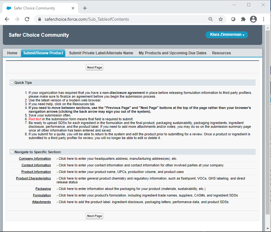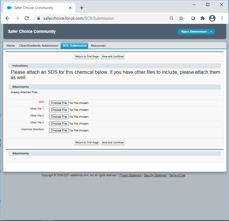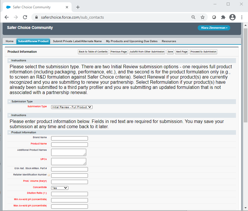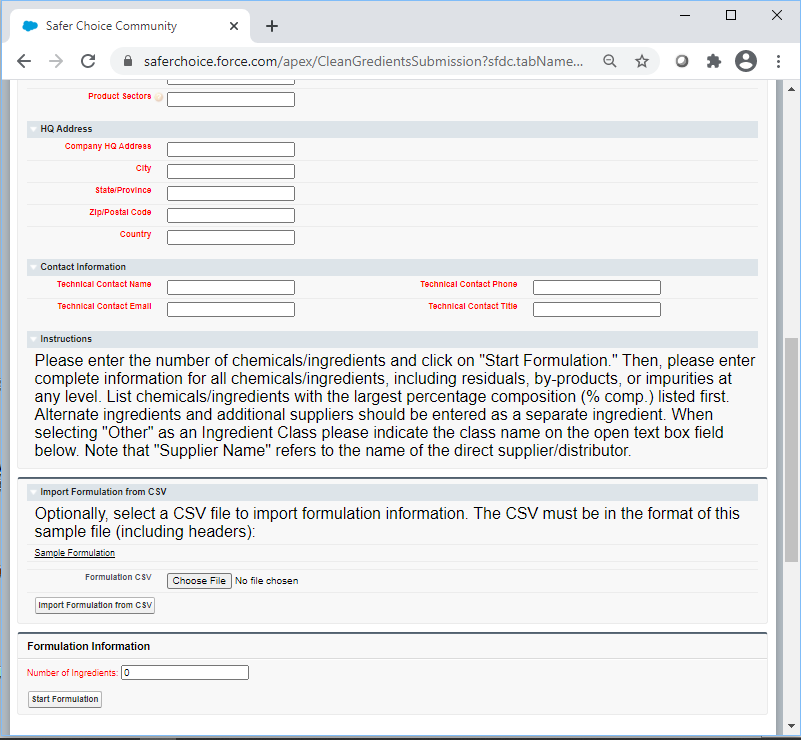Following are screenshots from the Product and Ingredient Submission forms in the Safer Choice Community cloud-based Salesforce data system. Please refer to Section 12b, IC #1 for a full list of data items collected. Note that the specific details of the screenshots may change over time as the Safer Choice program improves and/or modifies the system. However, the general and fundamental components of the Salesforce system will be similar to what is presented in the following screenshots.
