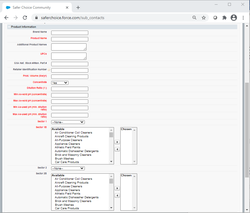 Sector 1B and Sector 2B: Pick list options are Air Conditioner Coil Cleaners; Aircraft Cleaning Products;-, All-Purpose Cleaners; Appliance Cleaners; Athletic Field Paints; Automatic Dishwasher Detergents; Brick and Masonry Cleaners; Brush Washes; Car Care Products; Carpet Care Products: Carpet Cleaners; Carpet Care Products: Spot Removers; Degreasers; Deicers; Descalers; Dish Soaps; Dry Erase Board Cleaners; Fire-Fighting Products; Floor Care Products: Floor Cleaners; Floor Care Products: Floor Finishes; Floor Care Products: Floor Strippers; Graffiti Removers; Granite/Stone Cleaners; Hand Soaps; HVAC Maintenance; Industrial Coating: Conversion Coatings; Industrial Coating: Pavement Treatments; Inkjet Printing Products; Kitchen/Countertop Cleaners; Laundry Products: Boosters; Laundry Products: Dryer Sheets; Laundry Products: Fabric Softeners; Laundry Products: Laundry Detergents; Laundry Products: Pre-Treaters; Leather Cleaners; Marine/RV Cleaners; Medical Instrument Cleaners; Metal Cleaner/Polishes; Microorganism-Based Products; Odor Removers; Oven/Grill/Barbeque Cleaners; Parts Washers; Pet Care Products; Rinse Aids; Semiconductor/Microelectronics Cleaners; Soluble Films; Stainless Steel Cleaners; Tire Additives; Toilet Bowl Cleaners; Tub/Tile Cleaners; Upholstery Cleaners; Window/Glass Cleaners; Wood Cleaners; Other Industrial/Institutional Products; Other Consumer Products