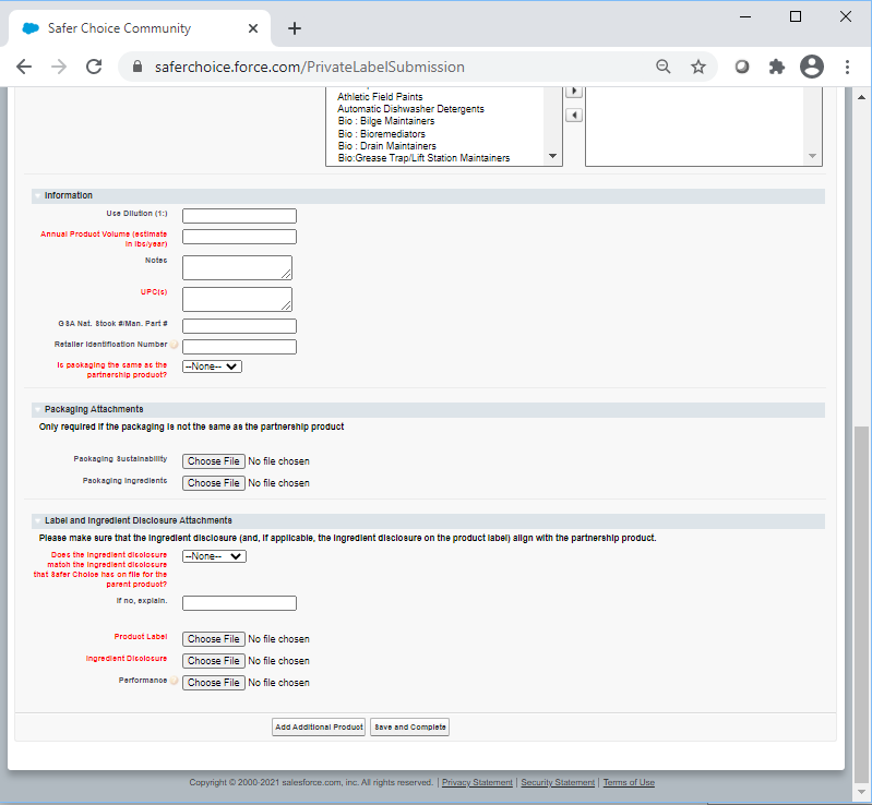 Following are screenshots from the Private Label Submission form in the Safer Choice Community cloud-based Salesforce data system. Please refer to Section 12b, IC#1 for a full list of data items collected. Note that the specific details of the screenshots may change over time as the Safer Choice program improves and/or modifies the system. However, the general and fundamental components of the cloud-based Salesforce system will be similar to what is presented in the following screenshots.