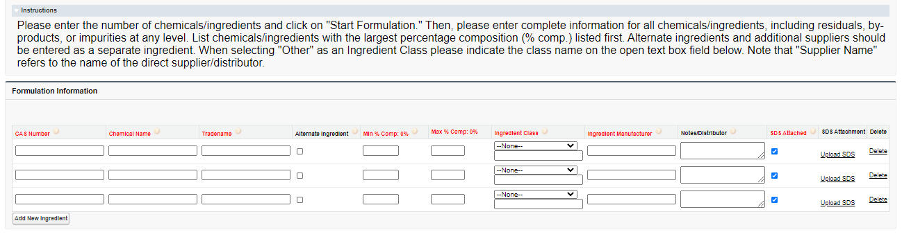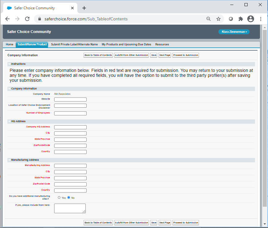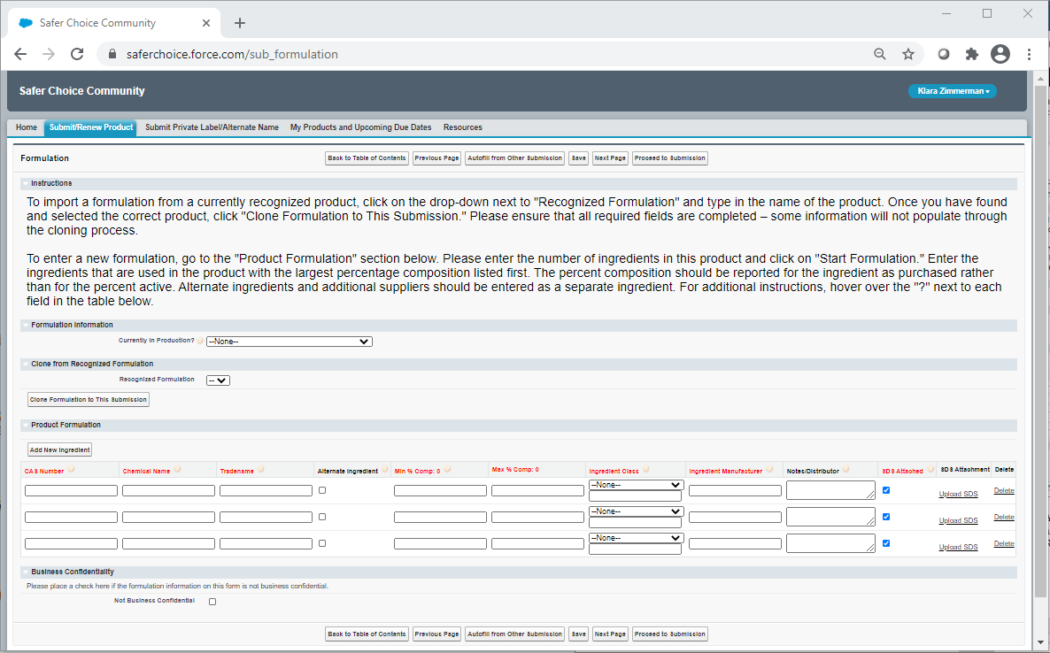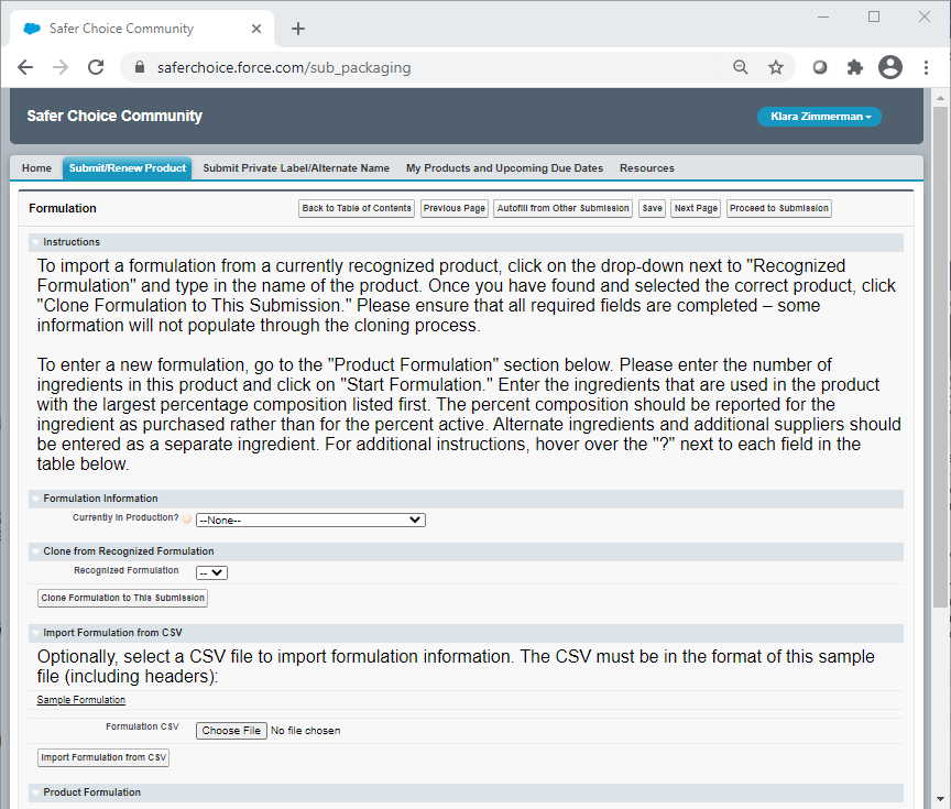 Following are screenshots from the Product and Ingredient Submission forms in the Safer Choice Community cloud-based Salesforce data system. Please refer to Section 12b, IC #1 for a full list of data items collected. Note that the specific details of the screenshots may change over time as the Safer Choice program improves and/or modifies the system. However, the general and fundamental components of the Salesforce system will be similar to what is presented in the following screenshots.