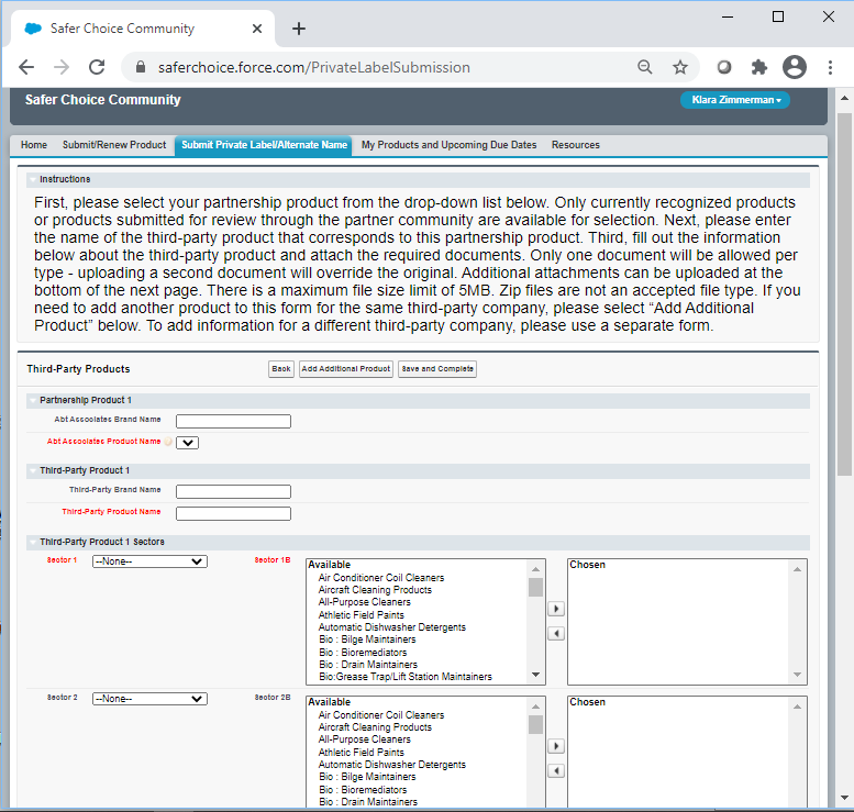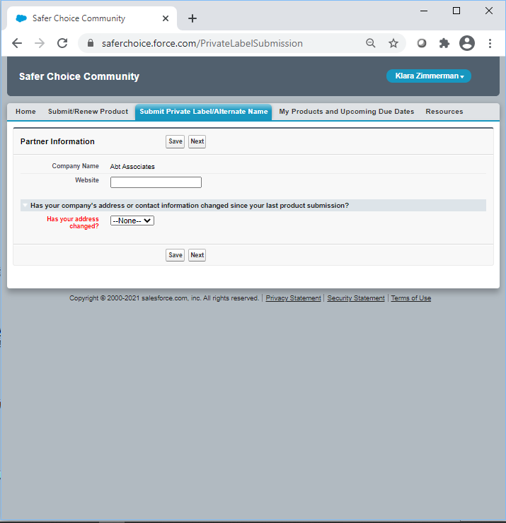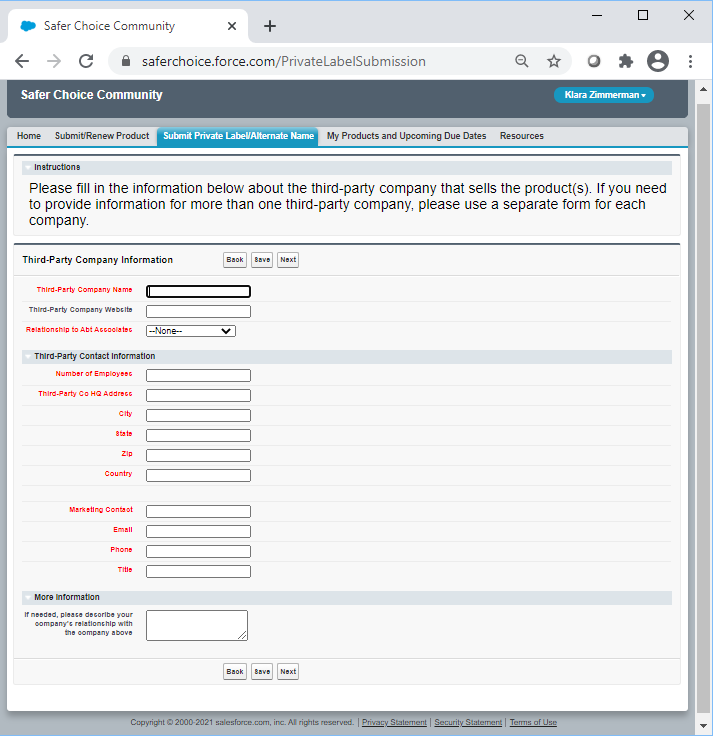 Following are screenshots from the Private Label Submission form in the Safer Choice Community cloud-based Salesforce data system. Please refer to Section 12b, IC#1 for a full list of data items collected. Note that the specific details of the screenshots may change over time as the Safer Choice program improves and/or modifies the system. However, the general and fundamental components of the cloud-based Salesforce system will be similar to what is presented in the following screenshots.