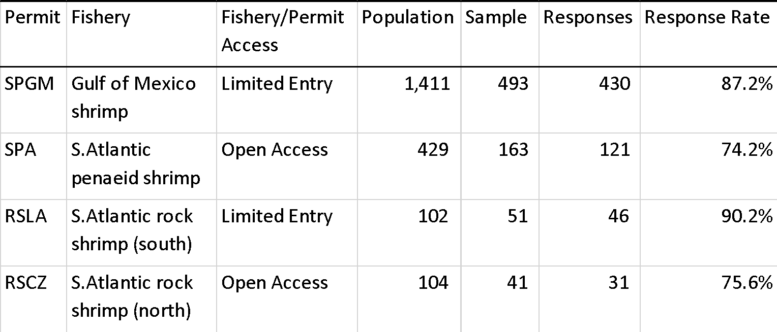 • Timing of the survey during the slow shrimp fishing season (winter and spring) and coinciding with tax time, when business records are being consulted and financial concerns are “top of mind.”