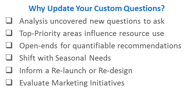 | When reviewing the custom questions tab, keep in mind these questions are used for segmentation analysis of the model data. It is suggested that you add, delete or change custom questions over time, as your needs or business objectives change. | ||||||