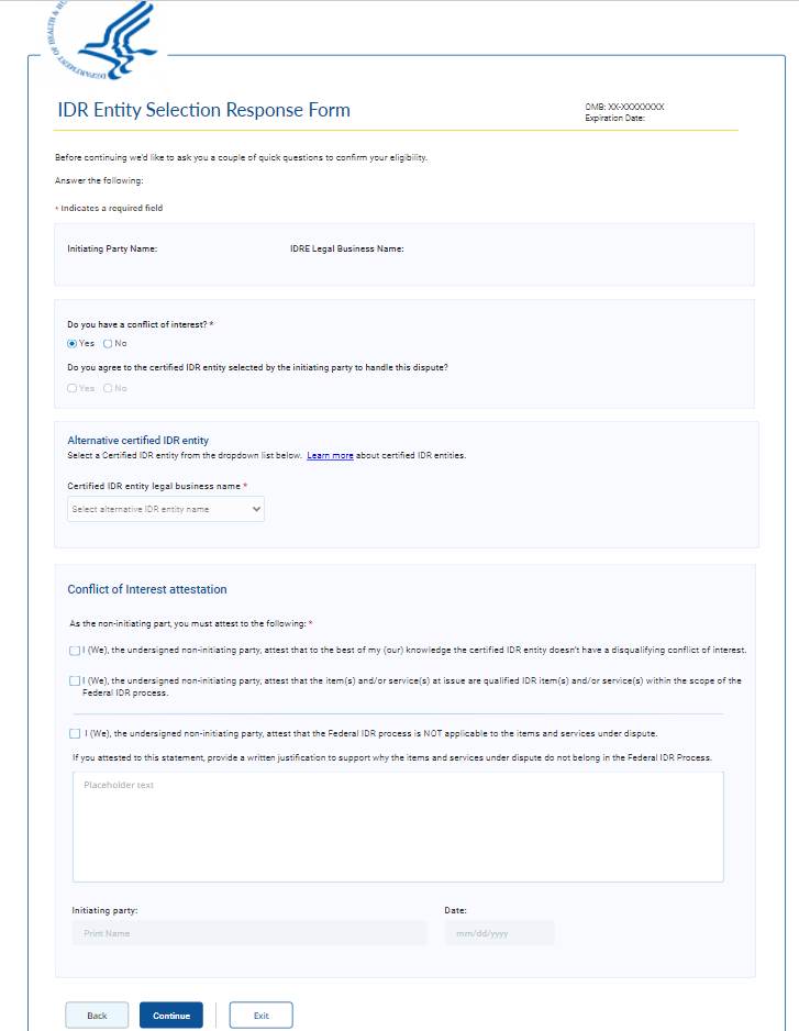 You must select an alternative certified IDR entity from the dropdown list. You had a conflict-of-interest with or did not agree with the initiating party’s selection of a certified IDR entity to handle your dispute.
