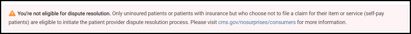 You’re not eligible for dispute resolution because the difference between the Good Faith Estimate for the service from the provider or facility and the actual billed amount is less than $400. Contact your health care provider to negotiate your bill or ask for financial assistance.
