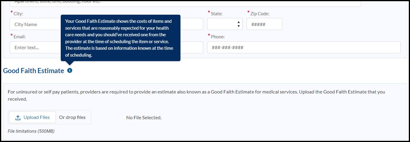 (Good Faith Estimate information bubble) Your Good Faith Estimate shows the costs of items and services that are reasonably expected for your health care needs and you should’ve received one from the provider at the time of scheduling the item or service. The estimate is based on information known at the time of scheduling.