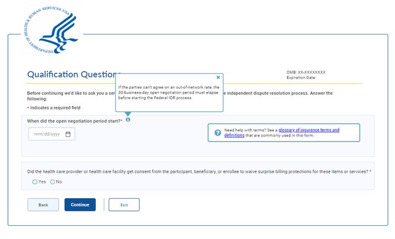 Before continuing we'd like to ask you a series of quick questions to confirm your eligibility for the payment dispute process. This process allows health care providers, plans, and issuers to resolve payment disputes. If you're an uninsured patient, self-paying patient, or insured patient visit https://www.cms.gov/nosurprises.