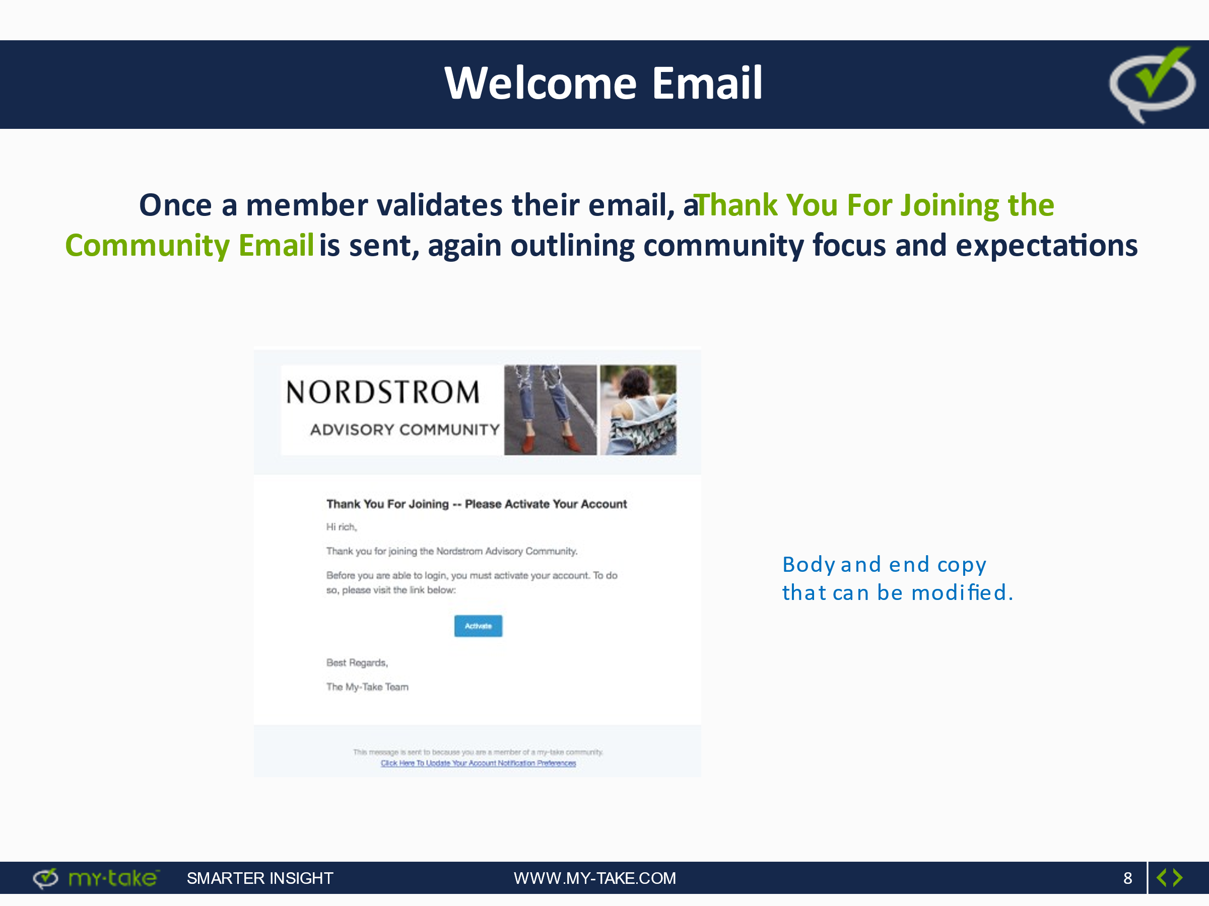 MyTake posts will immediately be visible when users submit them (that is, moderators will not review and approve each comment before it appears). Abt moderators will check the community at least twice each business day it is open—once in the morning, once before the end of the workday. Moderators may need to check the activity and respond to discussions more frequently if there is substantial activity. Conversely, if there is very low activity, moderators will pose additional questions to elicit more responses.