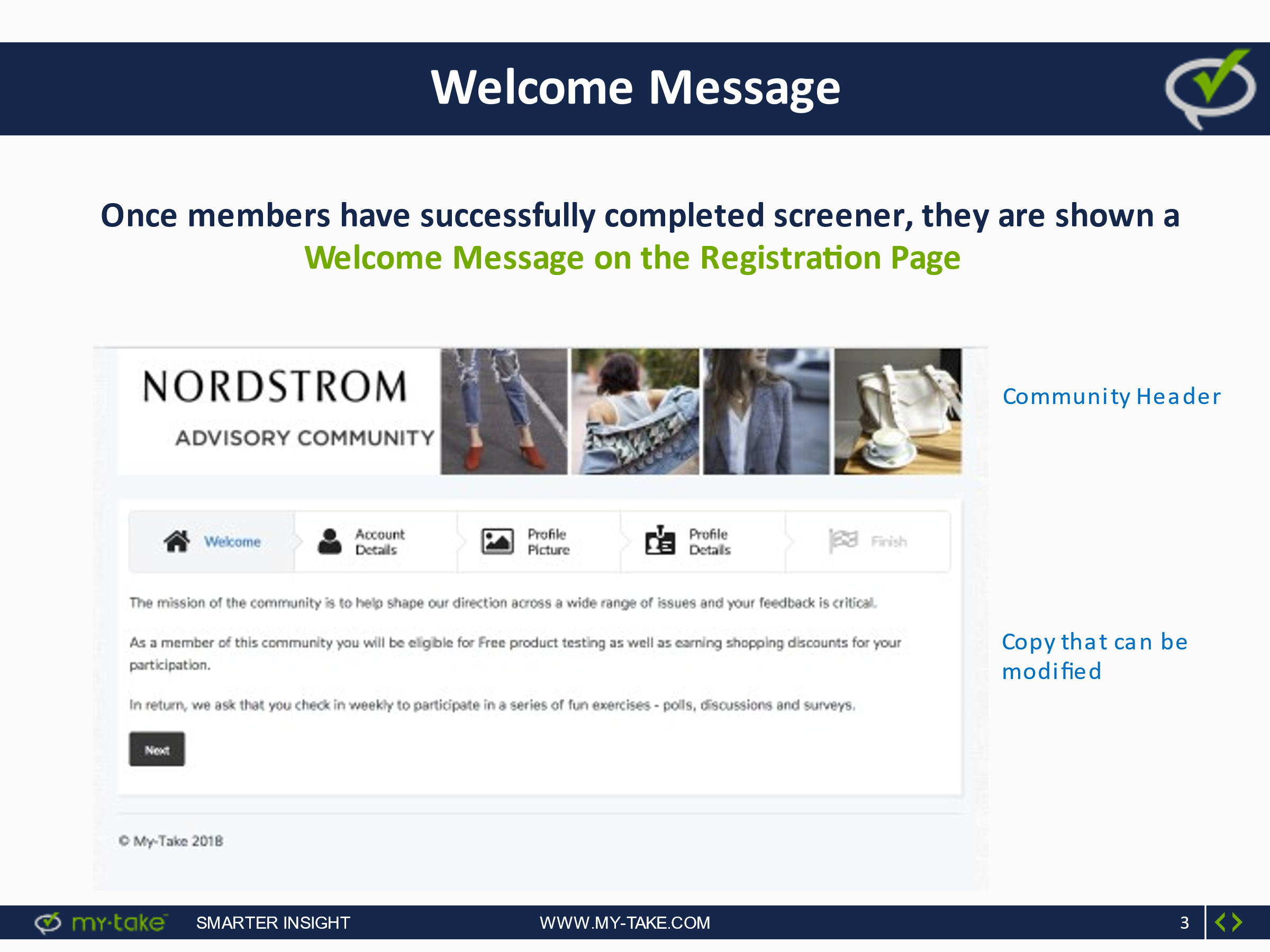 We will field the survey through My Take, the same platform we will use for the online community. My Take’s screening surveys do not require respondents to register as part of an online community. My Take has online survey capabilities similar to other online survey platforms, such as Qualtrics. The 20-question survey will take approximately 5 to 10 minutes to complete.