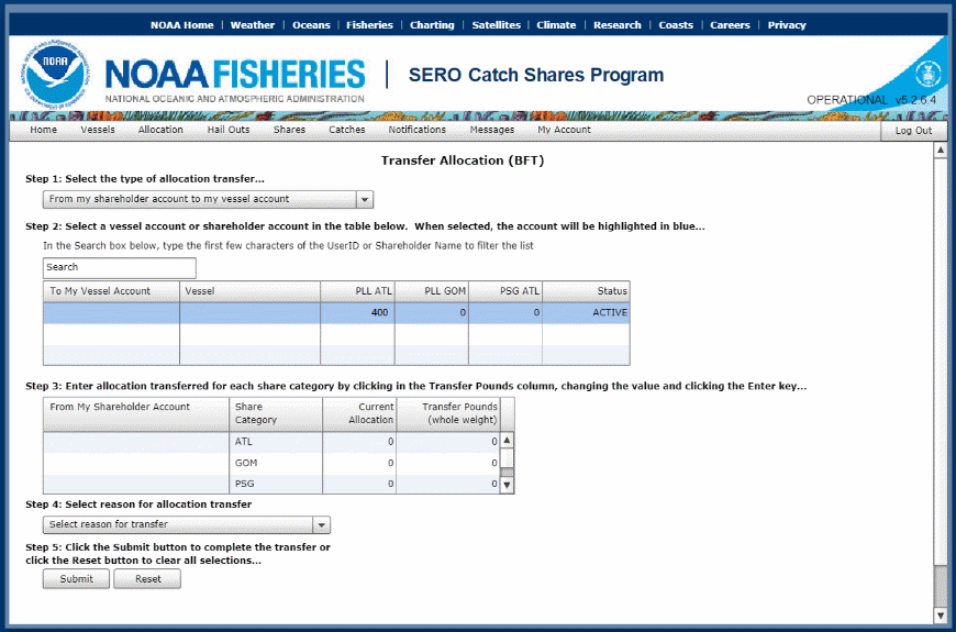 NMFS developed, and now maintains, the Catch Shares Online System to track IBQ shares and allocations. All data entry is via the internet-based webpage https://portal.southeast.fisheries.noaa.gov. Shareholders use the system to track their IBQ and lease allocations with other shareholders. Shareholders sign into the system to monitor their IBQ allocations, and to indicate the amount of quota allocation they would like to lease, and identify the other shareholder to whom they will transfer the allocation (lessee). The system tracks the amount of allocation leased and the cost of allocations. Along with the bluefin tuna dealer reporting system, it is used to monitor the status of the Longline category quota.