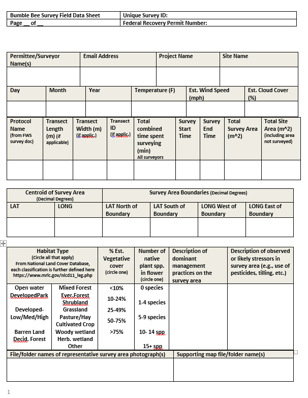 Use of this electronic reporting spreadsheet is optional at this time. However, the Service is taking steps to refine and formalize the spreadsheet with the intention of requiring Federal recovery permit holders to submit annual reports using this spreadsheet. Data requested in “Survey Location", Survey Area”, “Habitat Data”, and “Individual Bee Data” (highlighted in blue) worksheets are required for Federal Recovery Permit holders to fulfil annual reporting requirements. The “Detailed Habitat Assessment” worksheet is recommended for researchers surveying at a long-term monitoring site, or for those interested in more habitat detail. This detailed habitat datasheet was largely based on the Rusty Patched Bumble Bee Habitat Assessment Form and Guide by The Xerces Society.