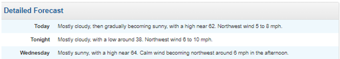 Short text (e.g., “Today: Mostly sunny, with a high near 71. Northwest wind around 8 mph”)