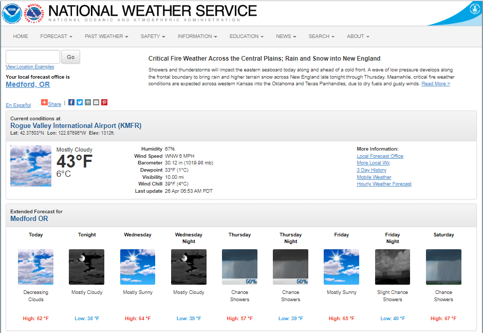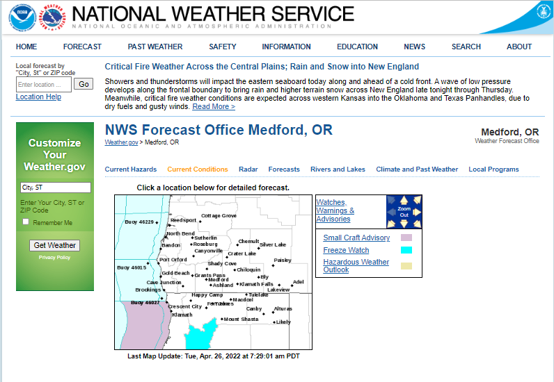 National Weather Service Weather Forecast Office home page (as a reminder, we are asking about visiting any weather forecast office home page; the image of the Medford, OR Weather Forecast Office home page is just an example)