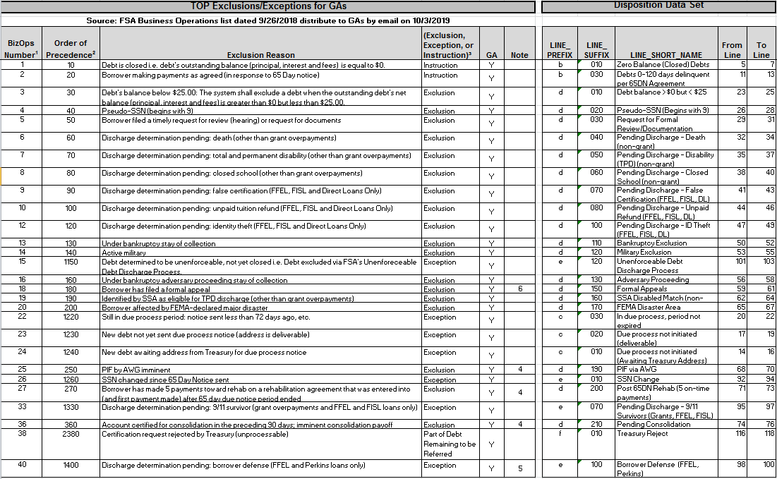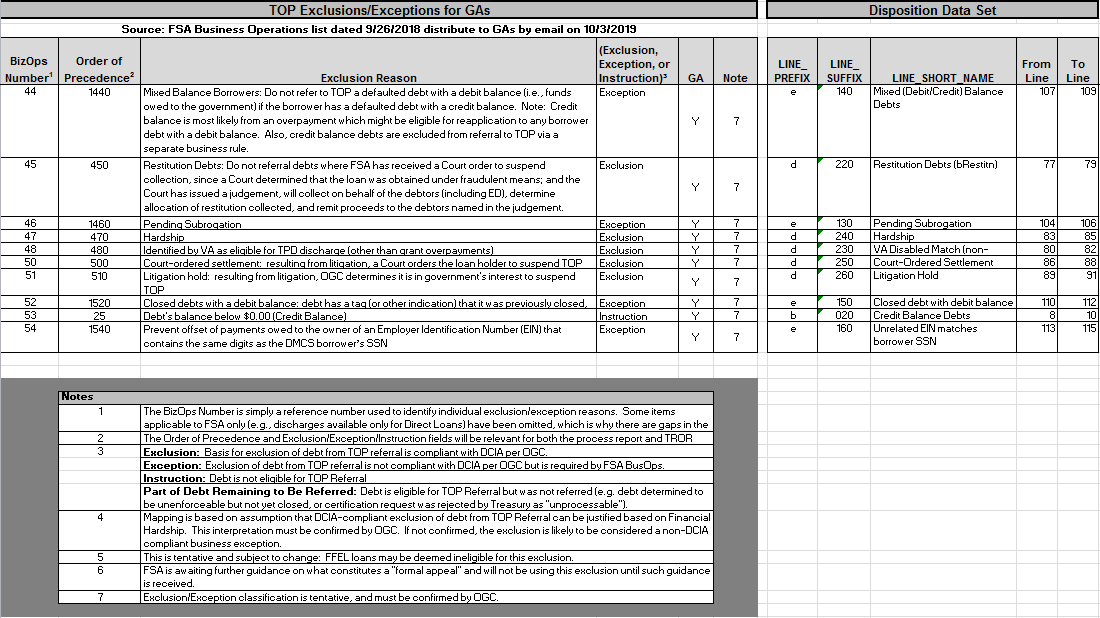 A set of criteria that is compliant with DCIA, that when met, FSA may exclude a debt from referral to TOP or inactivate a debt already at TOP as authorized by DCIA. Examples of excluded debt include debt less than $25 dollars, debt in bankruptcy, etc. |