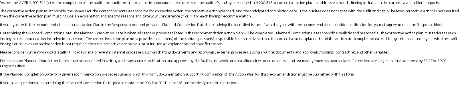 | information unless it displays a valid OMB number. This collection of information is intended for use by the SSG Fox SPGP as the Grantee's Corrective Action Plan (CAP). Your response |