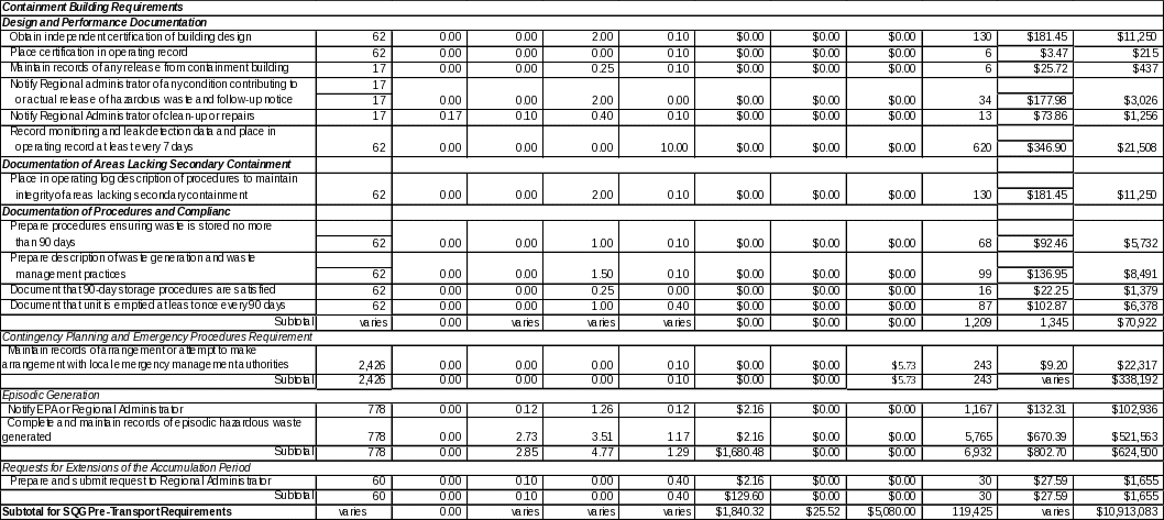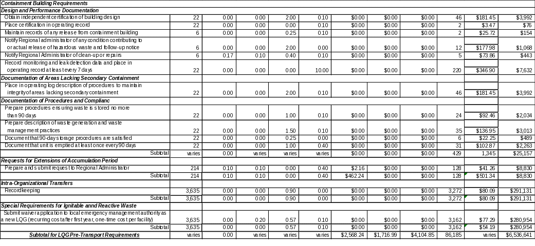 Under section 262.16(b)(5), EPA authorizes SQGs to store hazardous waste in containment buildings for 90 days or less pursuant to part 265, subpart DD. Part 265, subpart DD is potentially applicable to all large quantity hazardous waste generators. EPA applied the same methodology described in item three above to determine the number of SQGs that accumulate hazardous waste in containment buildings. EPA estimates that approximately 0.1 percent of the SQGs use containment buildings. EPA estimates that 29 percent of these affected facilities will be subject to the recordkeeping and notice requirements associated with hazardous waste releases, and that all of these facilities will require documentation to support compliance with subpart DD requirements.
