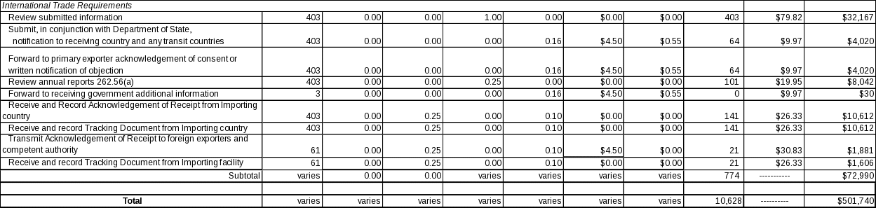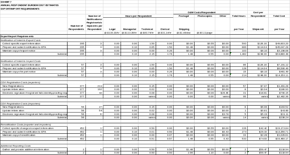 Based on export notifications tracked by EPA’s Office of Enforcement and Compliance Assurance (OECA), EPA estimates that approximately 702 generators will export hazardous waste each year under 40 CFR 262.53, and .55 - .57, and will be required to notify EPA of their intention to export hazardous waste, file an Annual Report with the Administrator summarizing the types, quantities, frequencies, and ultimate destination of all hazardous wastes exported during the previous years, and keep copies of relevant documents for a period of three years. Data were not available for generators re-notifying under 40 CFR 262.54(g). Exhibit 7 provides estimates on the number of LQGs and SQGs who intend to trade with OECD countries, as well as facilities who imported materials from OECD countries. These data were collected and provided by OECA