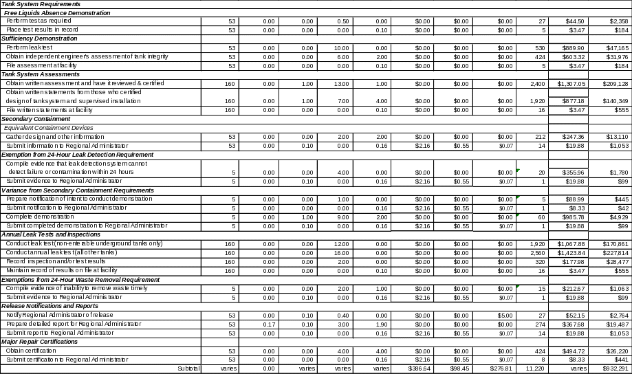 Depending on how the tank owner desires to comply with the regulations, he or she may need to submit one or more of the following: a no-free-liquids demonstration (§265.190(a)), existing tank system assessments (§265.191), an equivalent containment exemption (§265.193(d)), a variance from secondary containment requirements (§265.193(g)), or annual leak tests and inspections (§265.193(i)). Most LQGs seeking to operate under these conditions have already made the required demonstrations. In general, only LQGs recently subjected to hazardous waste regulations will need to perform these demonstrations. EPA estimates that approximately three percent are subject to the leak tests and that one percent of LQGs are subject to the other demonstration and testing requirements in sections 265.190 through 265.193.