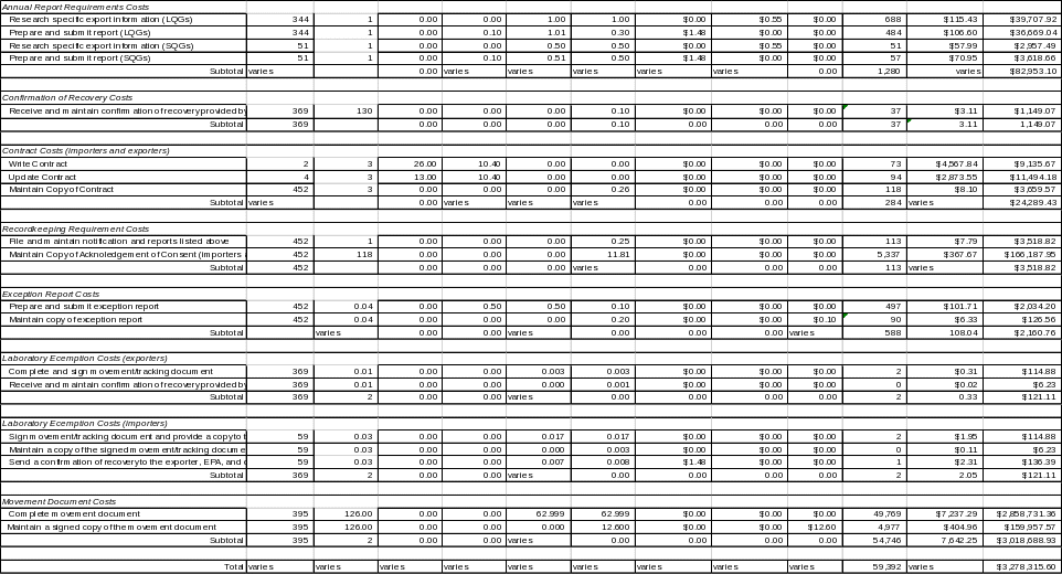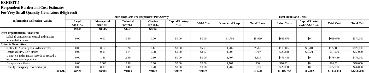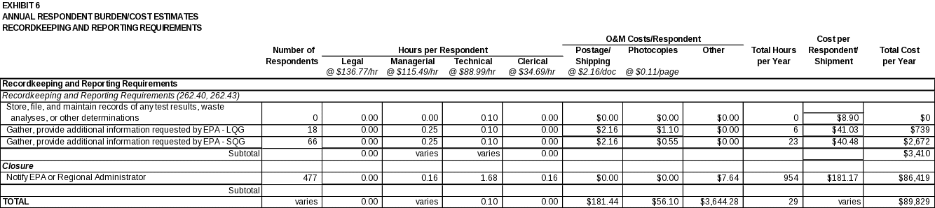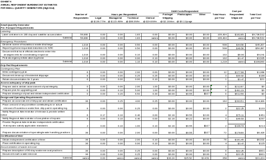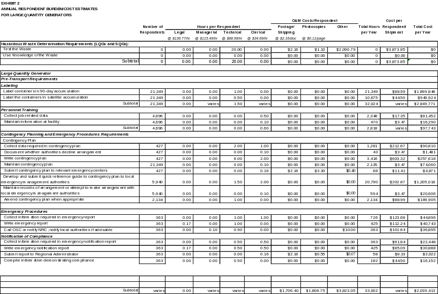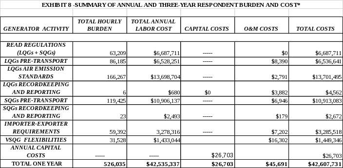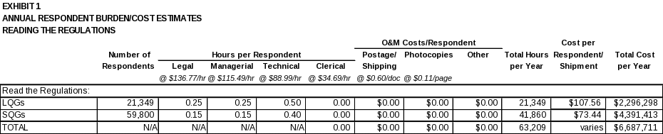Exhibits 1 through 7 estimate the costs to generators based on the cost of labor, operation and maintenance (OM), and capital. EPA estimated respondent burden hours and costs associated with all of the requirements covered in this ICR in the following exhibits: Exhibit 1 addresses both LQG and SQG respondent burden for reading the regulations; Exhibit 2 addresses LQG pre-transport requirements; Exhibit 3 addresses LQG air emission standards; Exhibit 4 addresses SQG pre-transport requirements; Exhibit 5 addresses VSQG pre-transport requirements, Exhibit 6 addresses LQG and SQG reporting requirements, Exhibit 7 address specific export and import requirements for all generators; Exhibit 8 summarizes total annual aggregate respondent burden and costs for all activities, and exhibit 9 addresses the total annual estimated agency burden and costs.