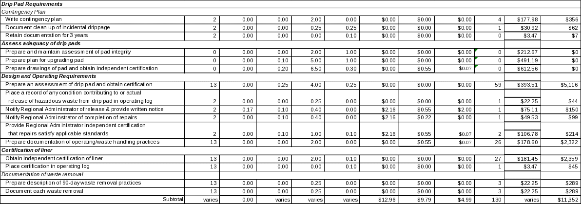 Under section 262.16(b)(4), EPA authorizes SQGs to store hazardous waste on drip pads for 90 days or less pursuant to part 265, subpart W. Part 265, subpart W is primarily applicable to those facilities conducting wood preserving operations. EPA determined the ratio of LQG drip pad operators who will be subject to part 265 subpart W regulations to the total number of LQGs, and applied that ratio to the total number of SQGs to determine the number of SQG drip pad operators that will be subject to the requirements of part 265 subpart W. EPA further expects that one percent of SQGs will prepare a contingency plan for incidental drippage and will have a condition contributing to an actual release of hazardous waste and be subject to the recordkeeping, notification, repair and certification requirements.