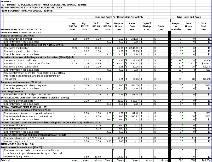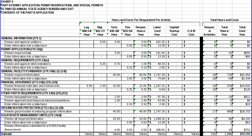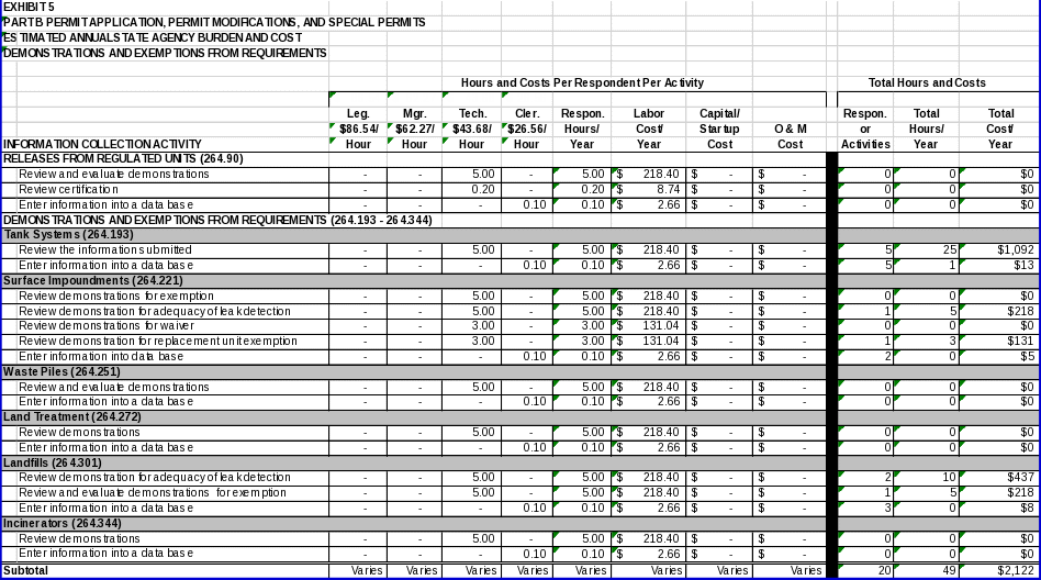 Forty-eight (48) States are authorized for the Part B permit program. The two States that are not authorized, Alaska and Iowa, have not received any Part B permits for the last 15 years. EPA estimates the State Agency hour and cost burden associated with all information collection requirements covered in this ICR in Exhibits 5 through 7. These exhibits detail the number of hours required to conduct each discrete information collection activity. Exhibit 8 provides the annual bottom‑line State Agency burden associated with all information collection requirements included in this ICR.
