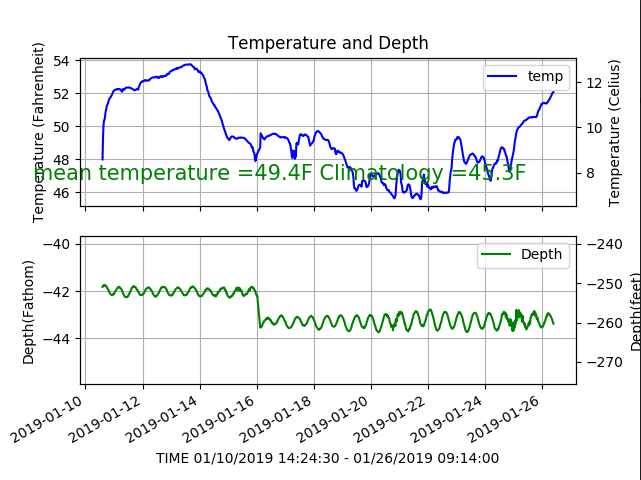 Figure 2 – Screenshot of temperature and depth readouts on a Gulf of Maine Lobster Foundation Deckbox from a successful probe haul on the F/V Lina Rose