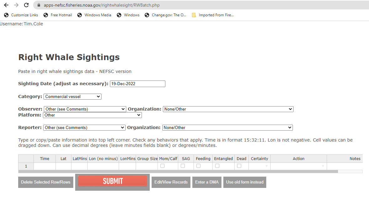 *Not Right Whale - If the sighting is NOT a right whale, enter into the database with Certainty unknown and Action none - unconfirmed/not Egs. Put any details of determination in the comments. (If someone calls to report a non-right whale sighting, then no need to enter it into the database; record only those instances where someone initially thought it was a right whale).
