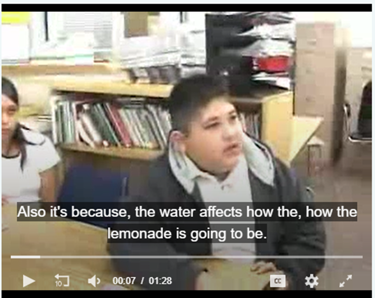In this lesson, students compare two lemonade recipes (the 1st recipe has 3 lemons to 2 cups water, and the 2nd recipe has 6 lemons to 3 cups water). The students have already written several conjectures about which recipe is “more lemony:; the clip picks up during the discussion about whether one conjecture is correct or incorrect. After some students claim one conjecture is not correct, the teacher provides another two recipes to add to the conversation.