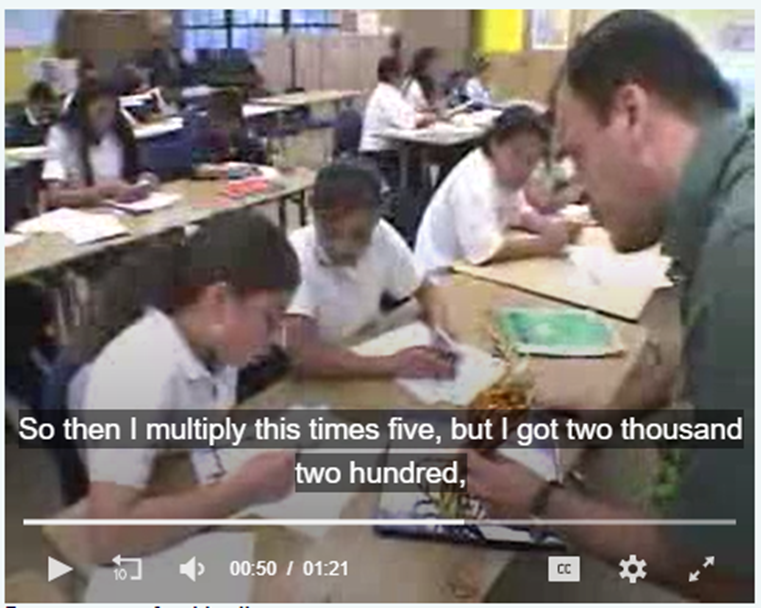 In this lesson students learn how to solve a proportion. They are working on the following problem: “How many students need to hold hands to cover the distance from LA to Long Beach (99,845 feet)?” To help solve the problem, the teacher had them determine that it takes five students to cover a 20-foot rope. The clip begins with the teacher checking on the progress of one of the students.